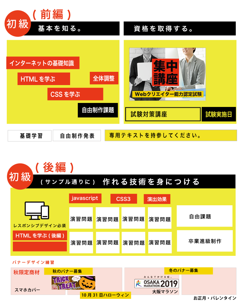 前編では、「ホームページ作成の基本」「Webクリエイター能力認定試験対策(資格取得)」の双方で構成されています。初心者が、ウェブサイトの仕組み・ウェブデザイン・もの作りの楽しさや興味を持つことから始めていきます。