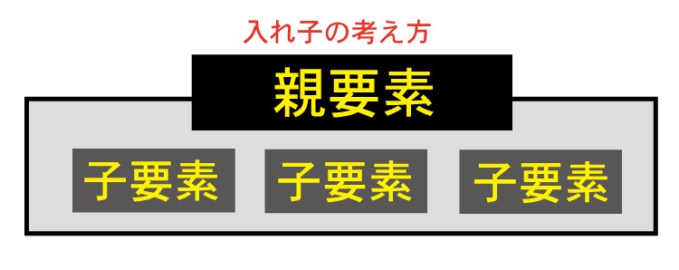 要素の中に要素を入れることができます。これを、「入れ子(状態にする)」といいます。コンビニを例えて、こんな考え方をしてみましょう。「雑誌のコーナー」を思い浮かべてください。雑誌というカテゴリーの中に、漫画や週刊誌が並べられていますね。それは、「雑誌」という親要素の中に、「漫画」という子要素が含まれている、と考えるとわかりやすいでしょう。身近なスーパーにも「果物コーナー」という親要素の中に、りんごやみかんやバナナがそれぞれ子要素となり、入れ子状態になっています。外の要素を「親要素」、内側の要素を「子要素」といいます。子要素の中に、また子要素を入れて配置していくので、レイアウトが複雑になればなるほど、タグの管理が難しくなります。