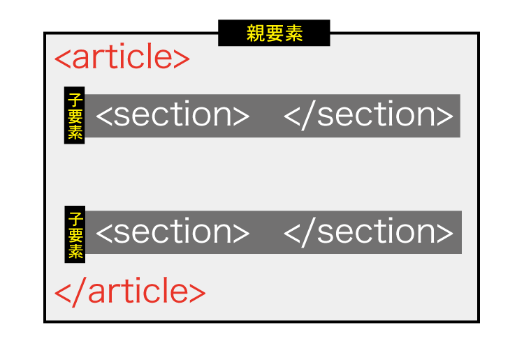 この親子(入れ子)関係を、タグにするとこのようになります。構文には、決まりがありますので、なんでも要素の中に、入れていいわけではありません。要素の中に入れてもいい子要素と入れてはいけない子要素がありますので、注意が必要です。