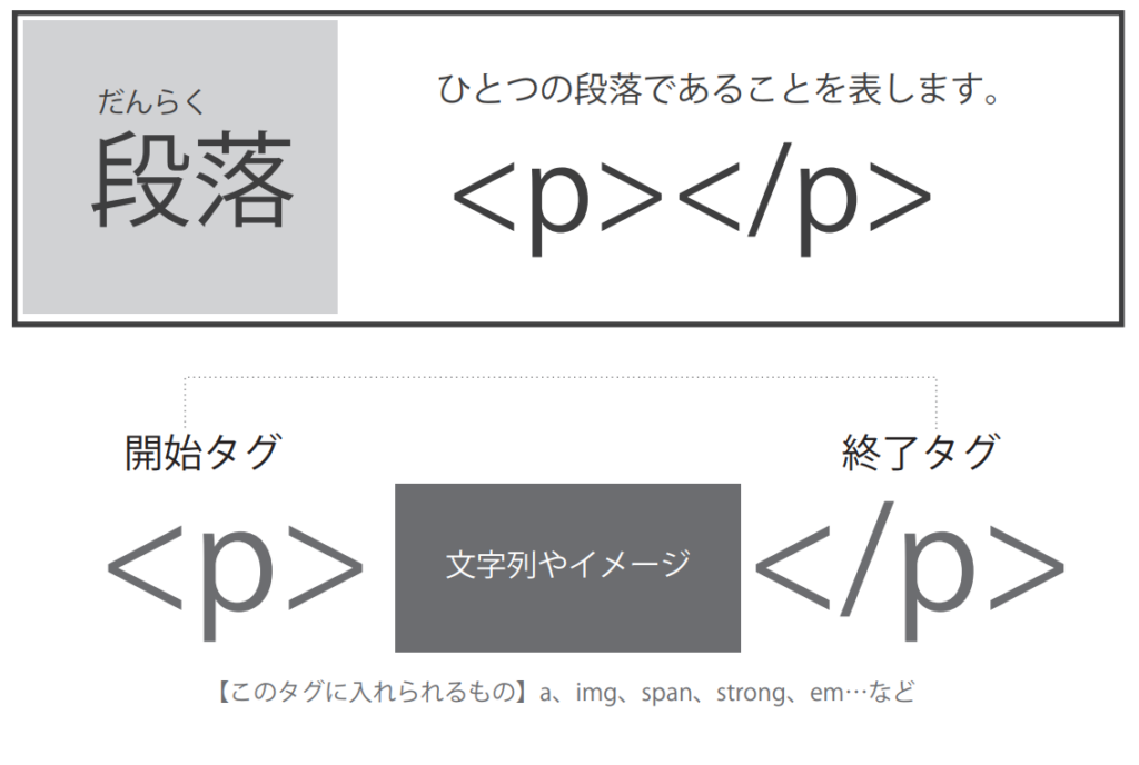 HTMLは、タグの集合体です。タグとは、「<」「>」(山かっこ)不等号記号で囲ったものです。前のタグを「開始タグ」、後ろのタグを「終了タグ」といいます。開始タグから終了タグで囲った中身を要素といいます。