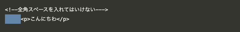 HTMLは、半角スペースや改行があっても表示に影響はありませんが、全角スペースは一文字開いてしまいます。少し慣れると、ソースコードを整えるためにスペースを連打してしまう人がいますが、誤認の原因になってしまいますから注意しましょう。