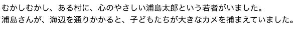 <p>むかしむかし、ある村に、心のやさしい浦島太郎という若者がいました。