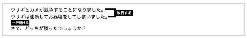 改行<br>は、段落と違って一行開くことなく、次の行へ改行されます。「段落」と「改行」の違いを把握しておきましょう。