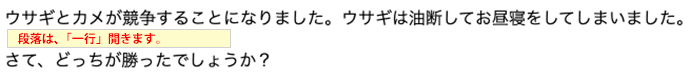 テーマの区切り、途中で話題を変える際の目印となる際、「区切り線(水平線)」を表示させることが出来ます。今までの復習を含めて、以下のお話を完成させてみましょう。