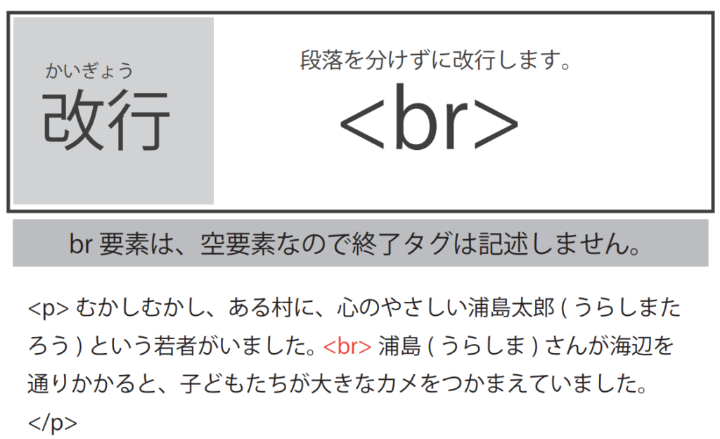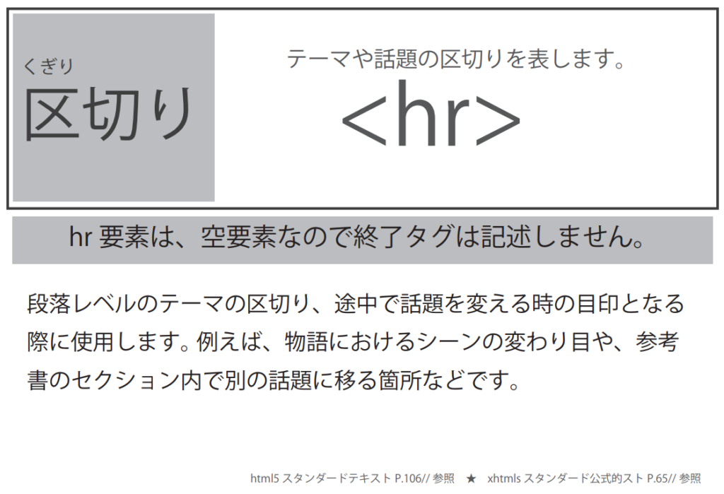 段落<p>を除いて、<br>と<hr>は空要素なので終了タグは要りません。比較的、短いタグなので覚えておきましょう。