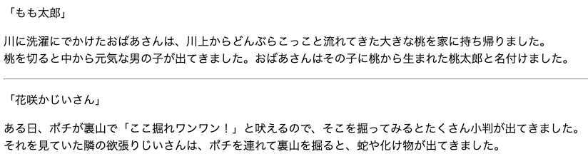 「もも太郎」川に洗濯にでかけたおばあさんは、川上からどんぶらこっこと流れてきた大きな桃を家に持ち帰りました。桃を切ると中から元気な男の子が出てきました。おばあさんはその子に桃から生まれた桃太郎と名付けました。「花咲かじいさん」ある日、ポチが裏山で「ここ掘れワンワン!」と吠えるので、そこを掘ってみるとたくさん小判が出てきました。それを見ていた隣の欲張りじいさんは、ポチを連れて裏山を掘ると、蛇や化け物が出てきました。