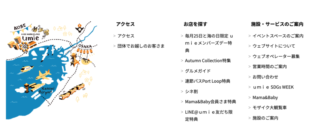 最近では、下部=footer要素にも、各ナビゲーション類が充実しています。(参考:ハーバーランド神戸)