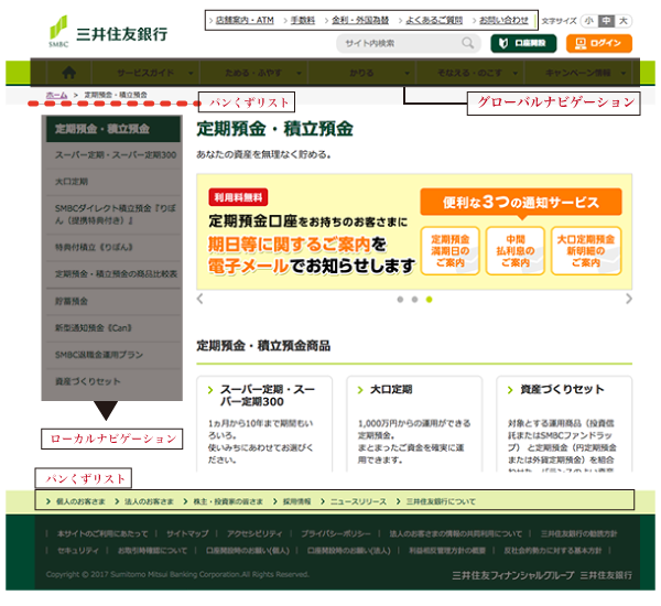 ページ内で最も軸となるコンテンツを指すことが多く、どの画面でも、同じメニュー構成・同じデザイン・同じ場所に配置されています。主要なリンクとなるので、カーソルや指が触れると色や形状の変化を施している場合が多く、最もクリックし易く目立つ位置に配置されています。(参考:NTT DOCOMO公式サイト:http://nttdocomo.co.jp)